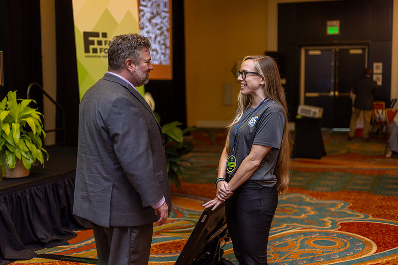 Xavier Ramey speaks at a podium with a microphone. The podium sign reads “Empowering the Next Generation: Health, Equity, and Innovation, Summer Institute 2023.” Green plants are in the foreground, and a banner in the background shows the logo for Fact Forward.